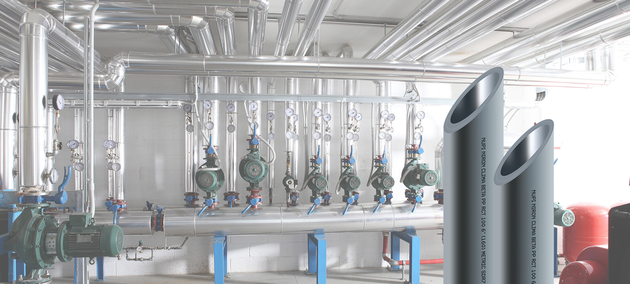 La gama de tuberías y accesorios Sistema NIRON PREMIUM fabricado en PP-RCT RA7050 ofrece las mejores prestaciones de resistencia y durabilidad en las salas de producción de ACS, especialmente en la zona de acumulación y recirculación donde se dan las condiciones de servicio y mantenimiento más exigentes y donde se realizan los distintos tratamientos de desinfección.